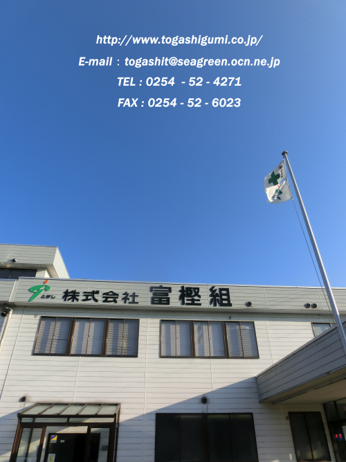 | 株式会社富樫組 〒958‐0823 新潟県村上市仲間町一枚下り639番地11 TEL:0254-52-4271 FAX:0254-52-6023 URL:http://www.togashigumi.co.jp E-mail:togashit@seagreen.ocn.ne.jp |